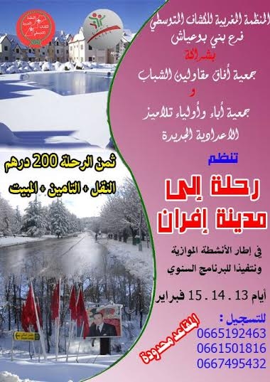 تنظم المنظمة المغربية للكشاف المتوسطي فرع بني بوعياش بشراكة من جمعية آفاق للمقاولين الشباب وجمعية آباء وأولياء تلاميذ الإعدادية الجديد رحلة إلى مدينة إفران ، في إطار الأنشطة الموازية ،وتنفيذا للبرنامج السنوي لكل من المنظمة المغربية للكشاف المتوسطي والجمعيتان المشاركتان، وذلك تحت شعار (بغيت نعرف بلادي ) وذلك أيام 13 و14 و15 فبراير 2015 للحجز و الاستفسار المرجو الاتصال على الأرقام التالية