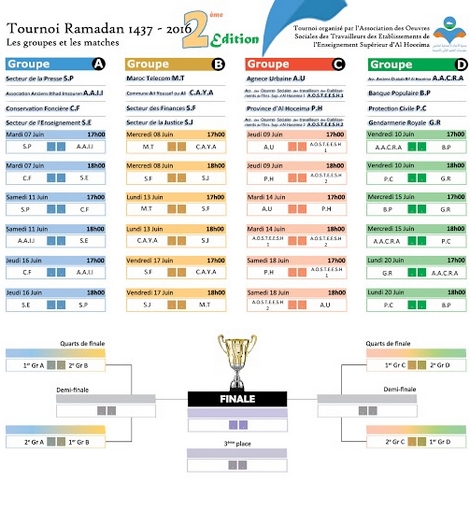 جرى يوم امس في رحاب المدرسة الوطنية للعلوم التطبيقية بالحسيمة افتتاح دوري رمضان لكرة القدم لفائدة القطاعات ، والمصالح العمومية والشبه العمومية والهيئات الرياضية في نسخته الثانية ، المنظم من طرف جمعية الأعمال الاجتماعية للعاملين بمؤسسات التعليم العالي بالحسيمة، والذي عرف مشاركة 16 فريق يمثلون مختلف المناطق بالحسيمة وهم كالتالي : - قطاع الصحافة - جمعية قدماء ومسيري اتحاد امزورن - جمعية قدماء شباب الريف الحسيمي – قطاع العدل – قطاع المالية – اتصالات المغرب – البنك الشعبي – الوكالة الحضرية – المسح العقاري – جماعة وقيادة ايت يوسف وعلي – عمالة الحسيمة – الدرك الملكي – الوقاية المدنية – قطاع التعليم- جمعية الأعمال الاجتماعية للعاملين بمؤسسات التعليم العالي بالحسيمة الفريق رقم 1 - جمعية الأعمال الاجتماعية للعاملين بمؤسسات التعليم العالي بالحسيمة الفريق رقم2 .