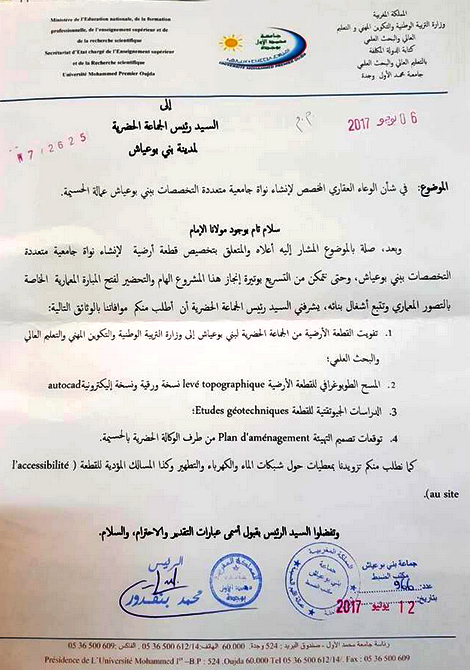 وكانت جماعة بني بوعياش قد توصلت بمراسلة من رئاسة جامعة محمد الاول بوجدة، تطلب منها تفويت القطعة المخصصة لاحداث نواة جامعية متعددة التخصصات لوزارة التربية الوطنية والتكوين المهني والتعليم العالي، من اجل التسريع من وتيرة انجاز هذا المشروع.