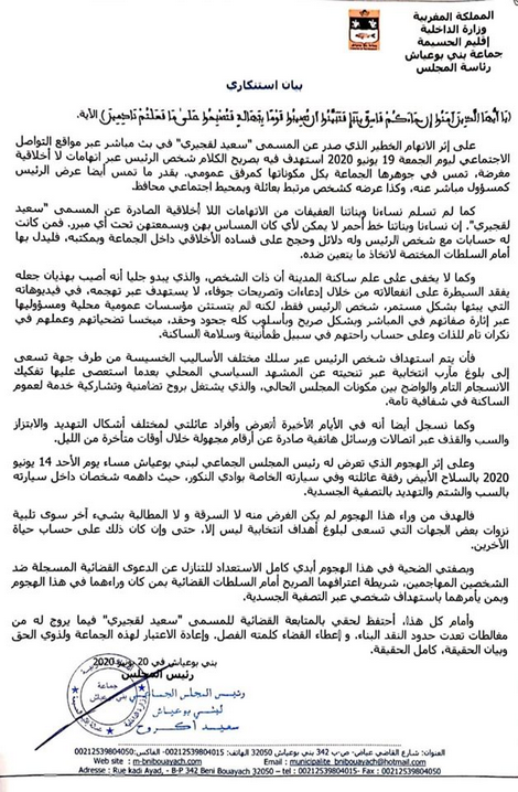 وأضاف سعيد اكروح في بيانه ان من لديه دلائل وحجج على وجود فساد أخلاقي داخل الجماعة او داخل مكتب الرئيس، فليدلي بها أمام السلطات المختصة لاتخاذ المتعين.