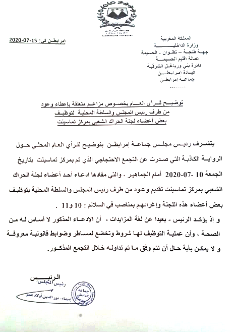 وكذب رئيس الجماعة نور الدين والاد عمر في بيان توضيحي ما جاء على لسان احد النشطاء في احد التجمعات الاحتجاجات، حول تقديم رئيس المجلس والسلطة المحلية وعودا لبعض اعضاء لجنة الحراك الشعبي بمركز تماسينت وإغرائهم بمناصب شغل في السلالم 10 و 11.