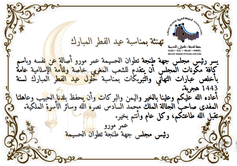 يسر رئيس مجلس جهة طنجة تطوان الحسيمة عمر مورو أصالة عن نفسه وباسم كافة مكونات المجلس أن يتقدم للشعب المغربي خاصة وللأمة الإسلامية عامة بأخلص عبارات التهاني والتبريكات بمناسبة حلول عيد الفطر المبارك لسنة 1443 هجرية.