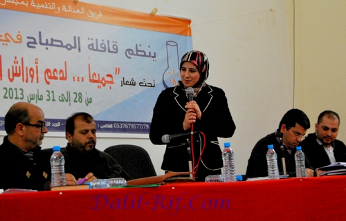 واففتح اللقاء بكمة للكاتب الاقليمي نبيل الاندلوسي رحب فيها بالحضور وبرلمانيي حزبه قبل ان يترك الكلمة لسعاد شيخي التي تطرقت في البداية الى تجربة الحكومة التي يقودها البيبجيدي ودعت الجميع سواء كبرلمانيين اوجمعيات المجتمع المدني او كمواطنين الى دعمها من اجل مواصلة اوراش الاصلاح التي شرع فيها حزب العدالة والتنيمية وحلفائه منذ تشكيل الحكومة على حد قولها، كما اوضحت شيخي ان المغرب يعيش في وضوح تام ونوع من الاستقرار بعد الحراك الشعبي الاخير بقيادة حركة 20 فبراير، مشيرة الى ان الصراع القائم الان في المغرب ليس صراعا سياسيا وانما صراع بين الاصلاح الذي يتجسد في العدالة والتنمية والفساد الذي اختار ان يواجه اصلاح الاوراش من اجل افشال الحكومة في اشارة الى حزب الاصالة و المعاصرة حسب تعبيرها.
