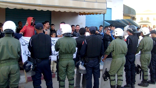 وحاصرت القوات العمومية التي حجت إلى موقع تنظيم الاحتجاج بكثافة، الوقفة الاحتجاجية من كل الجوانب بغية منع المحتجين من الخروج للشارع العام وهو ما استنكروه بشدة من خلال رفع شعارات منددة بالحصار والمنع الذي يطال خرجاتهم الاحتجاجية.