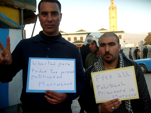 هذا ورفع المتظاهرون لافتات وملصقات كتب عليها بمختلف اللغات عبارات تطالب باطلاق سراح المعتقلين السياسيين بالسجون المغربية وذلك في إطار الحملة الوطنية والدولية للمطالبة باطلاق سراح المعتقلين السياسيين.