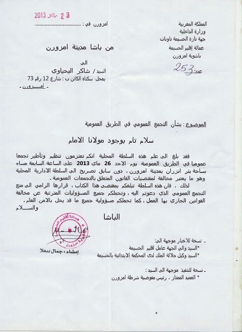 علمنا ان حركة 20 فبراير موقع امزورن قد توصلت من طرف باشا مدينة امزورن، ليلة الخميس 23 ماي الجاري، برسالة منع للوقفة الاحتجاجية التي كانت تعتزم الحركة تنظيمها مساء يوم الأحد المقبل/ 26 ماي 2013 بالقرب من ساحة 24 فبراير، حيث بررت السلطة المحلية قرار منعها للوقفة الاحتجاجية بذريعة انها لم تتوصل بسابق تصريح في الموضوع وبذلك تعتبره مخالفا لمقتضيات القانون المتعلق بالتجمعات العمومية.و يعتبر هدا ثاني قرار منع كتابي يسلم للحركة منذ انطلاقتها.