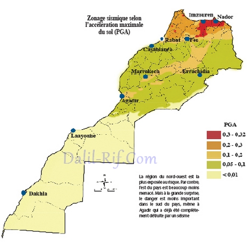 خلصت دراسة انجزها خبراء معتمدين من قبل البنك الدولي بتنسيق وإشراف وزارة الشؤون العامة والحكامة أنه خلال مدة 30 سنة تبلغ نسبة التعرض للزلازل في بعض المناطق 95 في المائة و في مقدمة هذه المناطق يوجد شمال المغرب و خاصة منطقتي الناظور و الحسيمة.