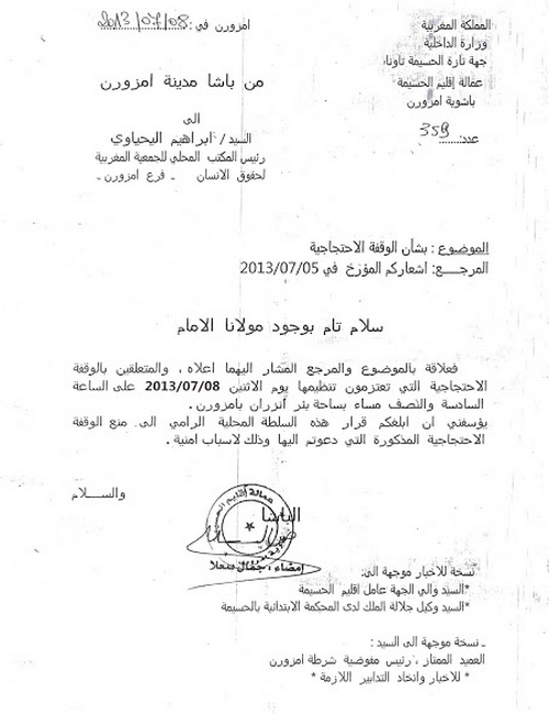 وكانت الجمعية قد توصلت بقرار منع الوقفة الاحتجاجية كتابيا من طرف باشا المدينة وذلك لاسباب وصفها بالامنية حسب ما ورد في وثيقة المنع الموجهة لرئيس الجمعية.