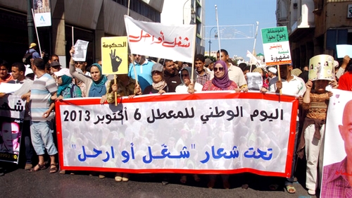 شارك الآلاف من المعطلين ينتمون إلى الجمعية الوطنية لحملة الشهادات المعطلين بالمغرب ومختلف مجموعات الأطر العليا صباح هذا اليوم الاحد 6 اكتوبر في مسيرة حاشدة بمدينة الرباط احتجاجا على السياسة التي تنهجها الدولة والحكومة في ميدان التشغيل وذلك تحت شعار "شغل او ارحل".