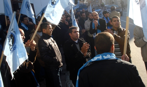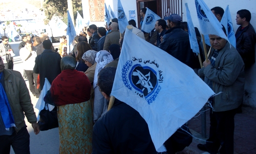 احتشد العشرات من مناضلي ومناضلات الاتحاد المغربي للشغل بالحسيمة ومن مناضلي الجمعية الوطنية للشهادات المعطلين بالمغرب ومن عموم الجماهير الشعبية، يومه الأحد 17 نونبر أمام مقر الاتحاد المغربي للشغل بالحسيمة، للمشاركة في التجمع الاحتجاجي الذي دعا له الاتحاد المحلي لنقابات الحسيمة للاحتجاج على السياسات اللاجتماعية للحكومة المتمثلة في رفع الأسعار واعتماد نظام المقايسة المشؤوم، والهجوم على القدرة الشرائية للمواطنين، واستهداف المكتسبات التاريخية للطبقة العاملة المغربية، وعلى رأسها أنظمة التقاعد، صندوق المقاصة، الحق في الإضراب، النظام الأساسي للوظيفة العمومية...، وللاحتجاج على المضامين التقشفية لمشروع القانون المالي لسنة 2014، والذي لا يستجيب لانتظارات وتطلعات العمال، والشباب، وعموم الجماهير الشعبية. وهو التجمع الاحتجاجي الذي عرف حضورا كبيرا لأجهزة الأمن بمختلف أنواعها وبأعداد كبيرة وغير مسبوقة في التعاطي مع تجمع احتجاجي نقابي.